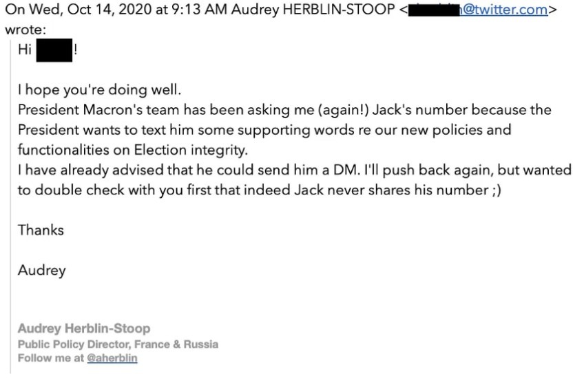 Le 14 octobre 2020, au plus fort de la campagne présidentielle américaine, Emmanuel Macron tente de contacter directement Jack Dorsey, alors PDG de Twitter. Son intermédiaire, Mohamed Adjène Tajette, conseiller numérique, est chargé d’établir ce contact. L’objectif officiel est de féliciter Twitter pour ses efforts en matière « d’intégrité électorale ». Mais l’objectif réel est d’établir un canal direct d’influence avec Dorsey, au moment où Twitter censurait déjà l’article sur Hunter Biden.