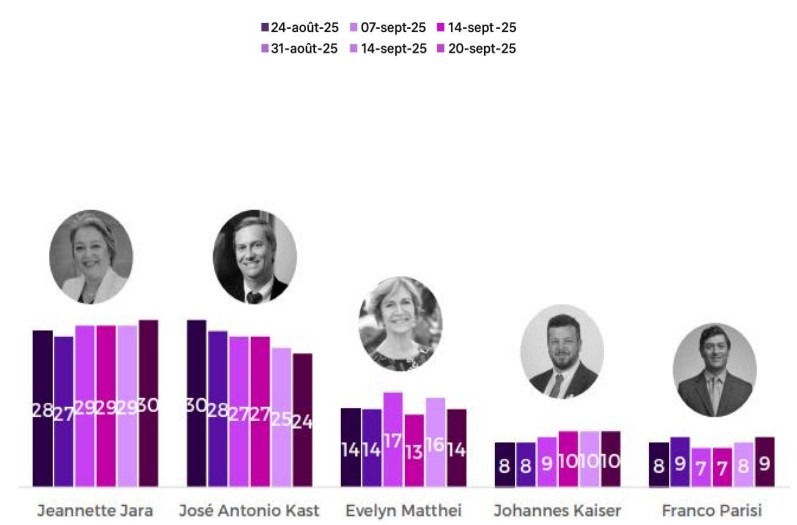 Si l’élection avait lieu maintenant, les deux candidats qui iraient au second tour seraient Kast et Jeannette Jara, le premier l’emportant largement au second tour.